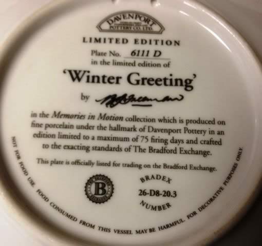 Winter Greeting. Limited edition Ceraminc Plate by B J Freeman Bradex 26-D8-20.3