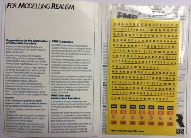 FMR: N Gauge: RailSigns - Alphabets for station fascia signage in black. Use with double arrow motifs in pack F801. PTE motif station totem signs for West Midlands, Greater Manchester, West Yorkshire and Strathclyde. Use with double arrow motifs in Pack F800. With Plastikard Starter Sheet. Image included for your information.