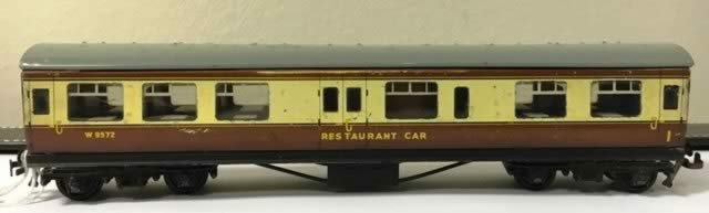 Hornby: Dublo OO Gauge: Restaurant Car 'W9572'. This Coach is Brown/Cream.