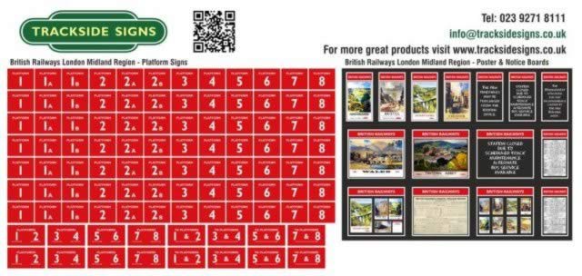 Tracksidesigns: OO Gauge: British Railways London Midland Region - Poster & Notice Boards. These die cut vinyl Platform Signs will add the finishing touch to your stations buildings on your layout. These signs are printed on Self Adhesive Gloss Vinyl and are individually die cut and are easily peelable and ready to affix to your buildings.