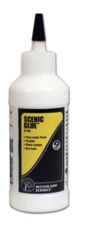 Woodland Scenic: Scenic Glue. A specially-formulated, non-odorous adhesive for applying landscape materials. Scenic glue is a thick, flexible, strong-hold adhesive that dries clear with a matte finish. Water-soluble and non-toxic. Apply Scenic Glue and press scenery material into adhesive